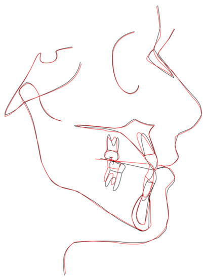 The patient correctly wore the aligners for 22 h a day with class III elastics anchored on the upper first molars and lower canines. After 12 months of treatment, the patient had improved tooth class, a positive anterior overjet, resolution of the posterior crossbite, and improved upper and lower alignment. At the end of the first phase of treatment (Figure 5), slight refinement was required. A few months later, the patient consolidated the molar and canine class I relationship, achieved a positive overjet and overbite, and resolved midline misalignment (Figure 6). At the end of the refinement phase, the patient was required to wear a long-term upper and lower Essix retention device during the night. Due to the transverse discrepancy between the upper and lower arch caused by class III malocclusion, to maintain adequate periodontal health of the upper posterior sectors, it was preferred not to expand the upper arch excessively and therefore not to resolve the crossbite of the second molars. From a cephalometric point of view (Figure 7 and Table 2), the inclination of the lower incisors and interincisal angle improved, which resulted in an aesthetic and functional enhancement. Pre-post-cephalometric evaluation, made with Deltadent® software (Outside format, Pandino, Italy), is reported in Table 3 and cephalometric tracing superimposition is shown in Figure 8.