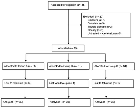 A total of 115 women were considered eligible for the study, and, after the application of the exclusion criteria, 20 patients were excluded (Figure 1). Five patients were lost during follow-up. Thus, ninety women (30 for each group) completed the follow-up and were eligible for data analysis.