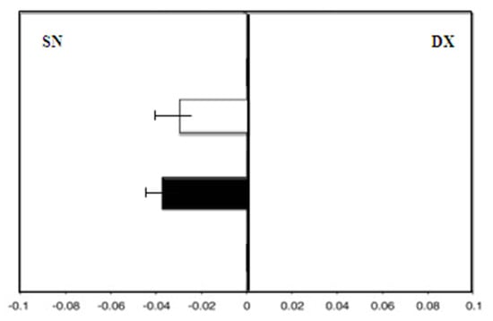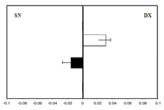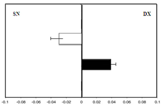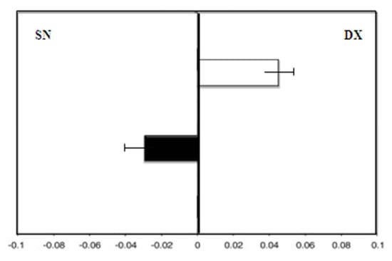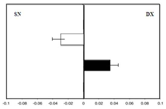 The hand-use effect presented a rightward deviation with the dominant right hand (F = 3.0) and a leftward deviation with the left hand (F = −1.8; p = 0.01) (Figure 7).