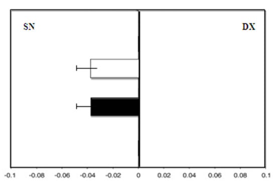 Group A (control group): mean deviations (± SD) from the true center (mm) in visual line bisection at zero time (in white) and after 36 months (in black) with the dominant right hand. Negative values reflect a deviation to the left of the objective middle, and positive values reflect a deviation to the right of the objective middle.