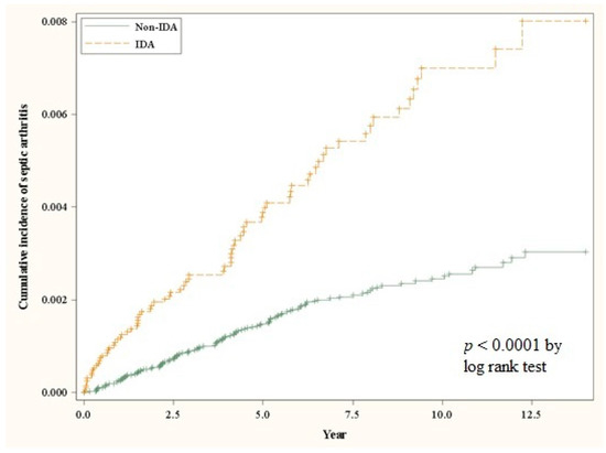 The cumulative incidence curves for the occurrence of septic arthritis for the IDA and control cohorts.