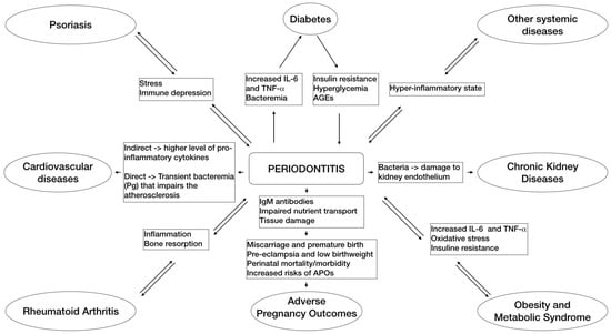 As summarized in the Proceedings of a Workshop jointly held by the European Federation of Periodontology and the American Academy of Periodontology [], periodontal disease has been associated with diabetes [,,], cardiovascular diseases (CDV) [,,,,], adverse pregnancy outcomes [,,], obesity [,], metabolic syndrome [,], chronic obstructive airways disease [,], cognitive impairment such as Alzheimer’s [,], rheumatoid arthritis [], chronic kidney diseases [,], psoriasis [], depression [], osteoporosis [,] and cancers [,]. The understanding of these associations is further complicated by the fact that several of these relationships may be bidirectional or even interrelated between systemic outcomes.