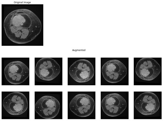 Only images containing lesions were selected from the MRI scans, exported from DICOM (Digital Imaging and Communications in Medicine) format and labeled according to the type of lesion, and placed in different folders (0 for benign tumors, respectively, and 1 for malignant tumors). In order to obtain a model with significant performance, a large and curated dataset is needed. For the dataset used in the study, different image processing techniques were applied, with the main goal of having enough data for training a model. Data augmentation is a preprocessing technique in which sample from the dataset is chosen and, by applying different operations on it, other samples are obtained, similar with the original one but not different enough to change the label of the input. Data augmentation techniques can prevent a deep learning model to overfit the training data [23]. To generate new data, the following operations were applied for each image in the dataset: brightness change, contrast change, horizontal flip, vertical flip, rotation (0–15 degrees), width shift, height shift, and shear. The augmented images obtained after this process are presented in Figure 2. After this step, all images were resized to a 224 by 224 by 3 tensor using cubic interpolation.