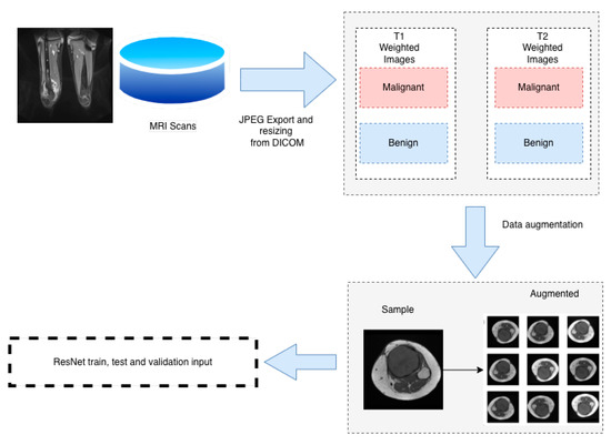 MRI provides qualitative information regarding tumor contents such as fat, water, and blood on the basis of the signal patterns. Regions with low signal intensity on T1-weighted images and high signal intensity on T2-weighted images reflect free water in the lesion. Regions of high intensity on both the T1-and T2-weighted images reflect fat. Regions of low intensity on both the T1-and T2-weighted images reflect cortical bone, fibrotic tissue, calcifications, or air. Contrast-enhanced MRI can appreciate the vascularization of the tumor and the evolution of this aspect after neoadjuvant therapy. In this way, the MRI guidance makes it possible to avoid biopsying necrotic areas. MRI is very helpful in local staging and surgical planning by assessing the degree of intramedullary extension and invasion of the adjacent physeal plates, joints, muscle compartments and neuro-vascular bundles. It can be used in assessing response to neoadjuvant therapy and further restaging. The post-therapeutic follow-up should also be carried out using MRI. The T1 signal intensity is compared to that of the muscle. This sequence is very important in the evaluation of bone marrow. Most bone tumors will be identified as lesions with low signal against a background of surrounding fatty marrow [17]. In order to improve the tumor’s vascularization aspect, suppressing the fat signal in T1 after injection of gadolinium can be useful. This contrast-enhanced MRI (CEMRI) can be useful in the differentiation between solid (hyperenhancing) and fluid-containing (non-enhancing) lesions. The reference for T2-weighted imaging is fat, particularly in anatomic regions where there is relatively little muscle. The bone tumors with a significant chondroid/cartilaginous or liquid component have a high signal intensity on T2 [18]. Water shows higher signal than fat on T2; suppressing the fat signal on this sequence can evaluate the presence and the extent of oedema, a very important element of bone tumors. CEMRI with gadolinium can improve the distinction of oedema from viable tumors. The tumor-associated oedema often does not correlate with the degree of malignancy or tumor aggressiveness. The distinction between tumor and oedema can be difficult but is essential for extension tumor appreciation. Tumoral tissue has a more heterogeneous signal than that of associated oedema [19]. The local extension of the tumor is another very important aspect well appreciated by MRI. Direct extension of the tumors into the articular cavity through a destroyed cortex is a direct sign of joint involvement, as opposed to joint effusion. Muscular invasion should be assessed by T1 and T2 with fat suppression as well. MRI, especially T2 with fat suppression, is the best method for the evaluation of neurovascular involvement, even better than CT or angiography. The most specific aspects are loss of the perivascular/perineural fat and associated stenosis [17]. The MRI is useful for the assessment of the evolution of the tumor after neo-adjuvant therapy or radiotherapy. Reduction of tumor volume, decrease of associated oedema and extent of marrow invasion are favorable indicators. The amount of necrosis is another predictive indicator. It is considered good (≥90% tumors necrosis) or poor (<90% tumors necrosis) [20]. Unfortunately, it is hard to be appreciated by direct observation; different types of software would likely become more useful in this direction [17]. Despite the fact that most bone tumors are resistant to radiotherapy, expected post-radiation MRI changes are the decrease of the tumors size and an increase in its T2 signal intensity (due to fatty transformation of the bone marrow) [21]. Distinction between recurrences and post therapeutic changes is another very sensitive topic which can be solved by MRI. Marrow replacement and cortical disruption are defining imaging elements for tumor recurrence. Lesions with low signal intensity on T2 generally do not represent recurrent tumors (sensitivity 96%), in contrast to high signal lesions [22]. Post-therapeutic changes (vascularized granulation tissue, neovascularization) usually lack high signal intensity on T2. The dataset used in our study contains 39 magnetic resonance image scans (MRI) with malignant and benign tumors confirmed by histopathological investigations. This research incorporates patients both men and women, who reached the ages of 15 to 80 years old between 2019 and 2021. Lesion location, bone type, patient age and gender are presented in Table 1. For each MRI scan in the dataset, the images for all three planes were extracted (i.e., sagittal, coronal, and transverse plane for both T1 weighted and T2 weighted images). The goal of this preprocessing step was to create two types of datasets from the MRI scans: T1 weighted images containing malignant and benign tumors and T2 weighted images containing malignant and benign tumors. After this step, a total of 1458 T1 weighted images were exported containing malignant and benign tumors and 648 T2 weighted images containing also malignant and benign tumors. Before the preprocessing step, each image was reviewed by a radiologist to detect anomalies in the images exported. Sample image tiles are presented in Figure 1.