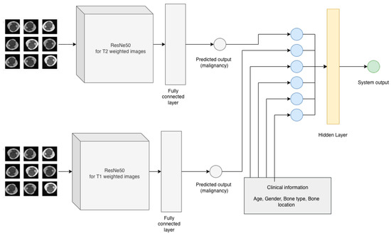 The goal of the study is to create a model that can predict the malignancy of a bone tumor based on MRI scan and clinical data of the patient. In order to address this, the challenge was divided into three components. The diagram of the proposed methodology is presented in Figure 3 and Figure 4. The first two components of the proposed system contain two residual networks models. The model used for each component is ResNet50, which is a CNN model proposed by K. He et al. [24] and has 50 convolutional layers in depth. K. He et al. [24] introduced residual blocks to address the vanishing gradients problem [25]. The authors proposed the layers of a CNN model to fit a residual mapping instead of stacking each layer directly. Since it was introduced in 2015, ResNet was used in many classification tasks [26,27]. In healthcare, ResNet has been used with success in tasks such as pneumonia detection in chest Xray images [28], knee anterior cruciate ligament detection [29], breast cancer detection [30]. The ResNet50 [24] architecture of the proposed system can be found in Table 2. Feyisope R. et al. [1] proposed a similar methodology for classifying bone tumors in which they have two models for predicting the output and a logistic regression for the clinical model. In their study, the MRI scans were manually segmented by a radiologist and the resulting images were used for training. Also, for the clinical model, Feyisope R. et al. [1] used as input the following information: sex, age, and lesion location. The image classifier used in their study is a pretrained EfficientNet [31]. ResNet50 is a deep learning model which needs a very large dataset to train. For the proposed methodology, each ResNet50 model was trained using transfer learning techniques. The weights loaded into each model were obtained from training each network on the ImageNet dataset. The dataset contains around 14 million labeled images with 20,000 classes [32]. Since the purpose of each pretrained ResNet50 model is to predict the malignancy from the MRI scan, the last fully connected layer was dropped and a layer containing one neuron was added.