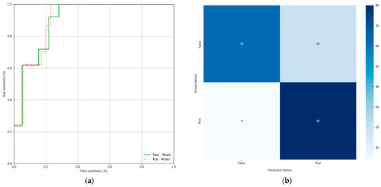 ROC curve illustrates the performance of a binary classifier and it is obtained by plotting true positives and false positives at different threshold settings and the confusion matrix of the proposed system (Figure 6a,b). The area under the ROC curve of a binary classifier is 0.5. From the ROC curve, it can be concluded that the obtained model is performing well at different thresholds on the data used in the study.