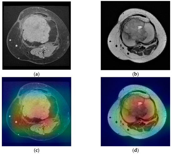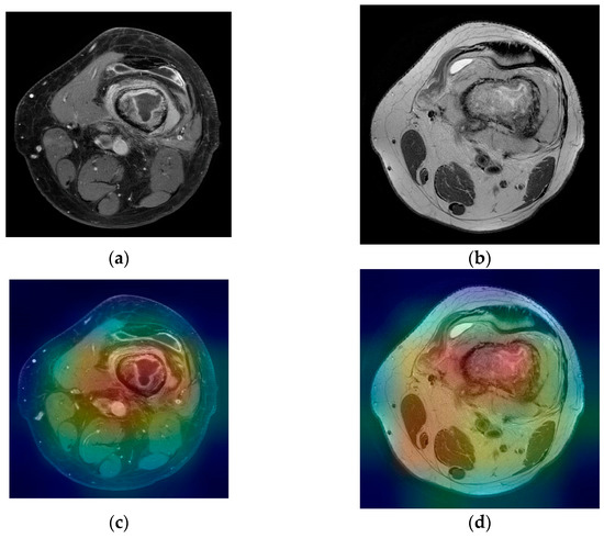 (a) Femur malignant tumor—T1 FS with contrast weighted image; (b) femur malignant tumor—T2 weighted image; (c,d) corresponding class activation maps.