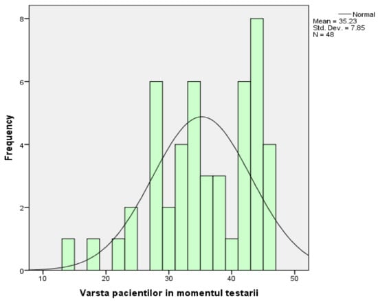 Regarding the structure data of the study, the group of patients consists of 48 adult patients: 15 men (31.25%) and 33 women (68.75%). Regarding the frequency of the declared ages of the patients at the time of testing, from the information existing after making the corresponding histograms, we can conclude that the arithmetic mean of the ages is 35.23 with a standard deviation of 7.85. The distribution curve is slightly asymmetrical to the left, which means that most people have ages grouped around the average, with a peak recorded on the right side of the distribution (the 8 people who are 44 years old).