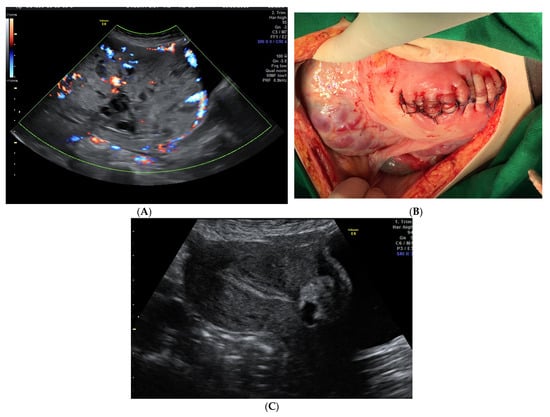 - Panaitescu, A.M.; Ciobanu, A.M.; Gică, N.; Peltecu, G.; Botezatu, R. Diagnosis and Management of Cesarean Scar Pregnancy and Placenta Accreta Spectrum: Case Series and Review of the Literature. J. Ultrasound Med. 2021, 40, 1975–1986. [Google Scholar] [CrossRef]