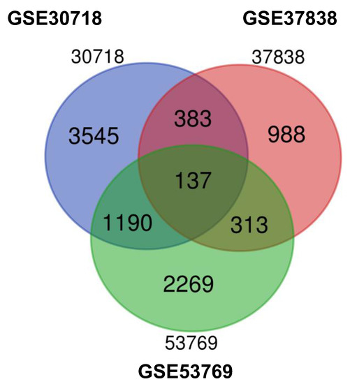 Venn diagram of DEGs common to all three GEO datasets. DEGs, differentially expressed genes; GEO, Gene Expression Omnibus.