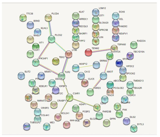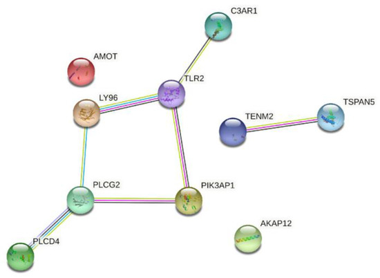 As constructed based on the STRING online tool by Cytoscape 3.8.0 (https://cytoscape.org/ (accessed on 25 January 2022), Cytoscape Consortium, USA), the PPI network of the 137 identified DEGs was identified (Figure 3). Furthermore, in this network, the top 10 genes with the highest connectivity were selected as hub genes (Table 1 and Figure 4), including A-kinase anchoring protein 12 (AKAP12), angiomotin (AMOT), complement C3a receptor 1 (C3AR1), lymphocyte antigen 96 (LY96), phosphoinositide-3-kinase adaptor protein 1 (PIK3AP1), phospholipase C delta 4 (PLCD4), phospholipase C gamma 2 (PLCG2), teneurin transmembrane protein 2 (TENM2), Toll-like receptor 2 (TLR2), and tetraspanin 5 (TSPAN5).