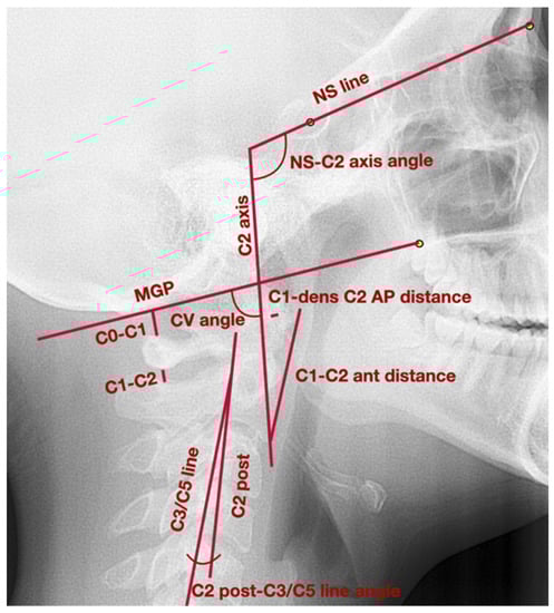 | C2 post-C3/C5 line angle | The angle between the lines: posterior wall of C2 odontoid process and C3/C5 line; the value of the angle is positive when the C2 axis is placed anteriorly to C3/C5 line; when the C2 axis is placed posteriorly to C3/C5 line, the value of the angle is negative | |