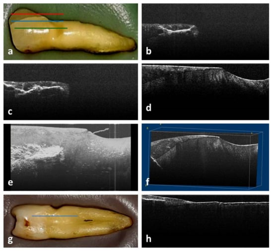 PM1 examination: (a) macroscopic aspect of buccal surface; (b) 2D OCT image of buccal area with concave fissure; (c) 2D OCT image of buccal area with crack in dentin; (d) 2D OCT image of buccal area with cracks perpendicular to the bottom of NCCL; (e) 3D image of buccal surface in the cervical area; (f) 3D volume viewer image of buccal surface in the cervical area; (g) macroscopic aspect of mesial surface; (h) 2D OCT image of mesial area with crack in enamel.