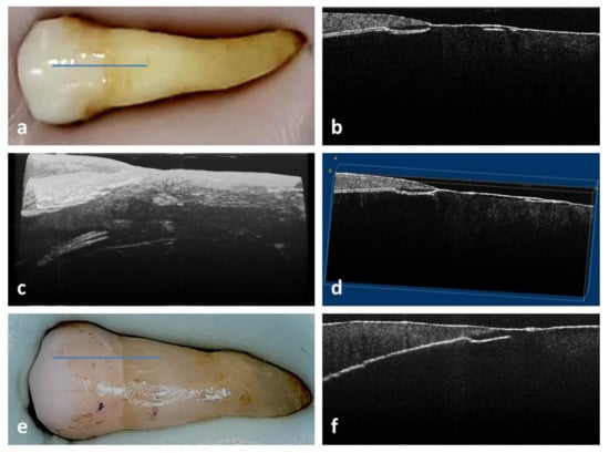 - Segarra, M.S.; Shimada, Y.; Sadr, A.; Sumi, Y.; Tagami, J. Three-Dimensional Analysis of Enamel Crack Behavior Using Optical Coherence Tomography. J. Dent. Res. 2017, 96, 308–314. [Google Scholar] [CrossRef]