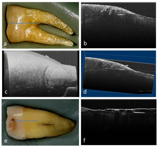 m2 examination: (a) macroscopic aspect of buccal surface; (b) 2D OCT image of buccal area with crack at enamel–dentin junction and cracks of radial appearance in the enamel; (c) 3D image of buccal surface in the cervical area; (d) 3D volume viewer image of buccal surface in the cervical area; (e) macroscopic aspect of mesial surface; (f) 2D OCT image of mesial area with crack in cement.