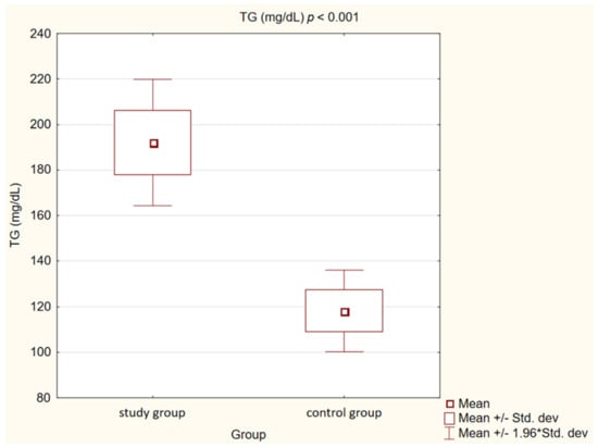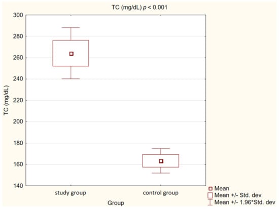 In the control group, we observed statistically significantly lower concentrations of TC, LDL, non high-density lipoprotein cholesterol (non-HDL) and TG (p < 0.001) than in the study group. High-density lipoprotein cholesterol (HDL) levels, on the other hand, showed no statistically significant differences (p = 0.47).
