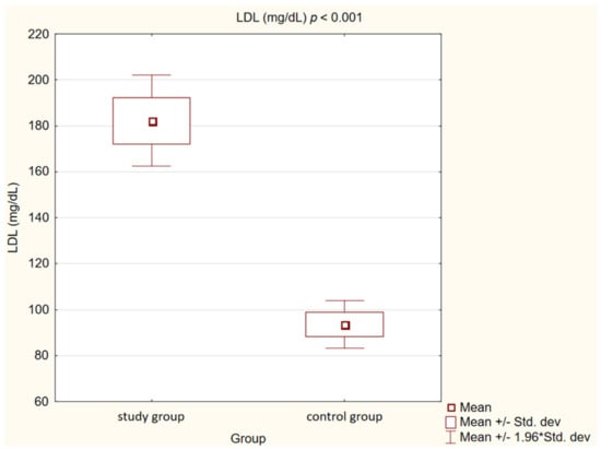 Concentration of low-density lipoprotein cholesterol (LDL) in study and control group.