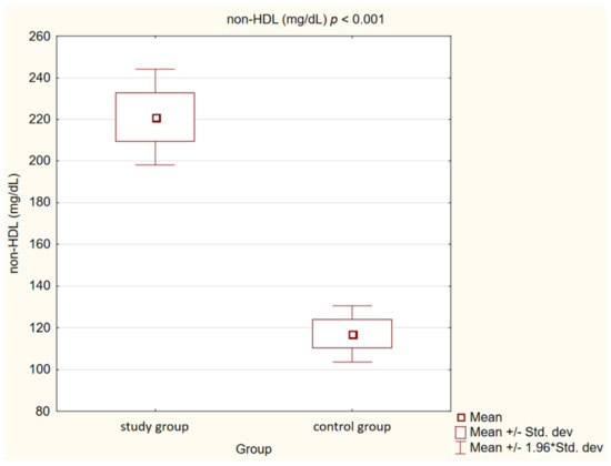 Concentration of non high-density lipoprotein cholesterol (non-HDL) in study and control group.