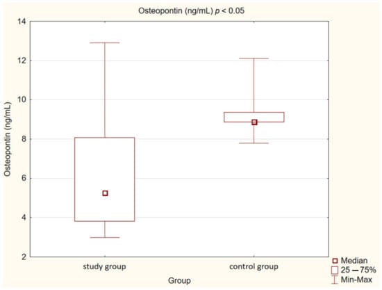 In our control group, the levels of OPN (p < 0.05) and OPG (p < 0.05) were also statistically significantly lower than in the study group. We observed the same correlation in the case of MMP-2 and MMP-9 concentrations (p < 0.001). Opposite observations were made in the case of MPO concentration, which was higher in the control group compared to the study group, but this correlation was not statistically significant (p = 0.073).