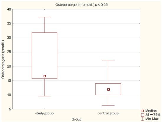 Osteoprotegerin (OPG) is a soluble glycoprotein that has been discovered as an inhibitor of bone resorption, but it is known that it is also active in other tissues, such as smooth muscle and endothelium []. Moreover, studies suggest that there is a correlation between the concentration of OPG and the intensity of the inflammatory process within the walls of blood vessels [].
