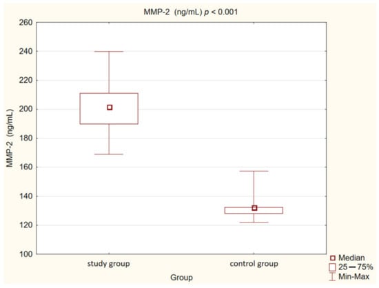 Concentration of metalloproteinase 2 (MMP-2) in study and control group.