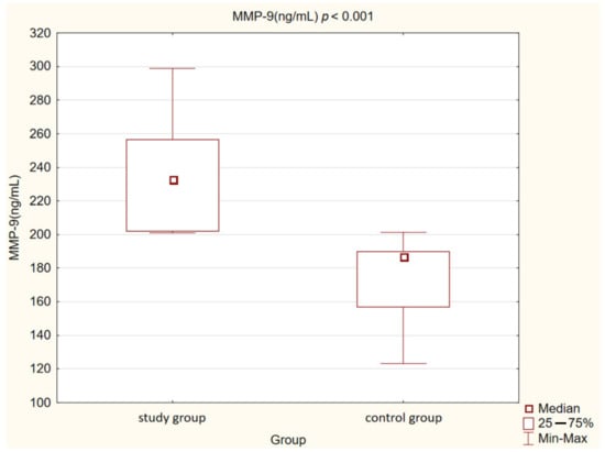 Concentration of metalloproteinase 9 (MMP-9) in study and control group.