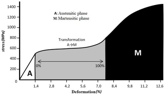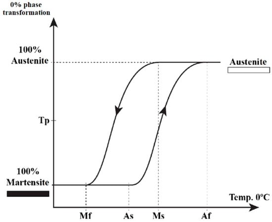 The same thing happens in the reverse direction, such that the temperature at which this phenomenon begins is called the austenite transformation start temperature (As) and the temperature at which this phenomenon is complete is called the austenite finish temperature (Af) [,,] (Figure 3). That is, the alloy does not change in the microstructural phase block, but there is a range of temperatures at which the alloy is transforming, and it is not completely in the martensitic phase or in the austenitic phase, but in a combination of both. This range of temperatures is called the Transition Temperature Range (TTR) or the Reverse Transition Temperature Range (RTTR), depending on the direction of the transition. The R-phase is located in a very narrow band in this range of transition temperatures.