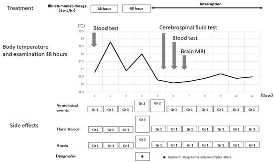 Yamamoto, Y.; Shimasaki, T.; Ishigaki, Y.; Fujimoto, S.; Takahashi, Y.; Kimura, S.; Aijo, K.; Takayanagi, M.; Mizuta, S.; Masauji, T.; et al. A Case Report on Dysgraphia in a Patient Receiving Blinatumomab: Complex Characters Are Easy to Find in a Handwriting Test. Medicina 2022, 58, 733. https://doi.org/10.3390/medicina58060733