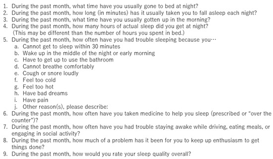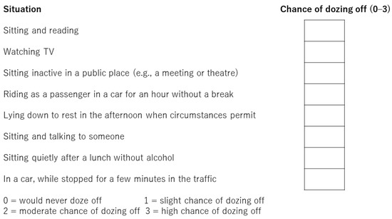 The PSQI is the gold standard for assessing sleep quality over a period of 1 month. This questionnaire includes 19 separate items and the following seven components: sleep quality, sleep latency, sleep duration, sleep efficiency, sleep disturbances, sleep medication, and daytime dysfunction. Each component is weighted equally and scored on a scale of 0–3 for a total score of 0–21. The contents of the PSQI are shown in Figure 1. The PSQI takes approximately 10 min to answer and 5 min to score. Higher scores represent subjective sleep quality disorder. Patients were classified into normal sleeping habit (PSQI score: 0–5 points), mild sleep disorder (6–8 points), moderate sleep disorder (9–11 points), and severe sleep disorder (12 points or greater) [19]. PSQI has been validated in various languages and clinical settings [20]. In this study, sleep disturbance was defined as a total score of ≥9 is indicative of sleep disturbance. The AIS is used to evaluate sleep disturbance and consists of eight questions rated on a scale of 0 (no problem at all) to 3 (extremely problematic). The contents of the AIS are shown in Figure 2. The total score ranges from 0–24, with a total score of 0–3 as normal, 4–6 indicative of subclinical insomnia, and ≥6 indicative of clinical insomnia [14]. AIS has been validated in the general population, psychiatric patients, and patients with insomnia [12,13,14]. In this study, sleep disturbance was defined as a total score of ≥6. The ESS comprises eight items related to falling asleep or sleepiness while engaging in seven different daily living activities and is used to assess excessive daytime sleepiness. The contents of the ESS are shown in Figure 3. The ESS score ranges from 0 to 24, and higher scores are indicative of more time spent in a sleep state during the day [16] and has been validated in a number of languages and clinical settings [17]. Sleep disturbance is defined as a total score of ≥11.