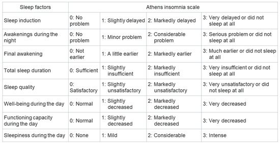 - Okajima, I.; Nakajima, S.; Kobayashi, M.; Inoue, Y. Development and validation of the Japanese version of the Athens Insomnia Scale. Psychiatry Clin. Neurosci. 2013, 67, 420–425. [Google Scholar] [CrossRef] [PubMed]