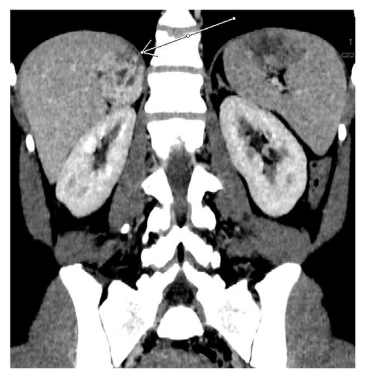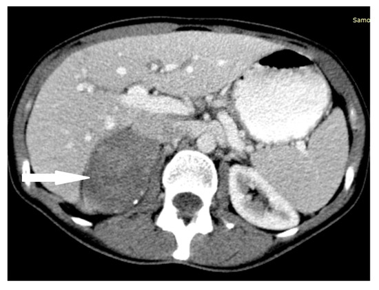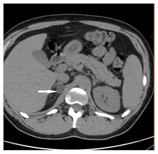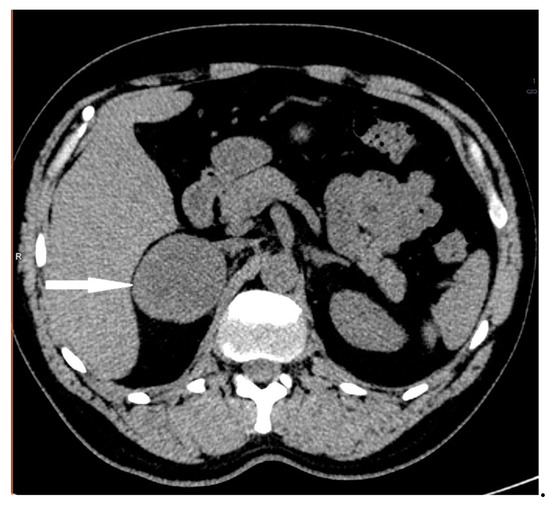 A 34-year-old male was referred to hospital due to recently detected impaired renal function (serum creatinine 3.47 mg/dL, BUN 59.5 mg/dL, GFR 20 mL/min). His past medical history included hypertension (since the age of 24, poorly controlled with three antihypertensive agents—nebivolol, perindopril, amlodipine) and nocturia. On admission, increased BP (160/100 mmHg), obesity (Body Mass Index (BMI)—31 kg/m2), and liver enlargement were noted. A subsequent non-contrast (due to renal failure) CT scan revealed the presence of a mass originating from the right adrenal gland, measuring 56 × 58 × 56 mm (Figure 3). Based on hormonal tests, hypercortisolism was excluded, and secondary to renal failure, hyperaldosteronism was found. The concentration of urinary metanephrine was significantly increased (89961 μg/24 h, norm 64–302 μg/24 h) (Table 1).