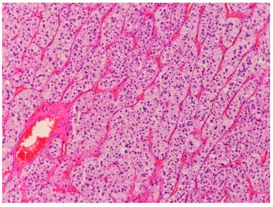 The patient underwent right-sided laparoscopic adrenalectomy. The surgery resulted in the normalization of potassium levels and a significant improvement in BP control. Histopathologic examination of specimens showed an adrenocortical adenoma with moderate cellular pleomorphism, without mitotic activity, features of necrosis, or vascular invasion (Figure 2).