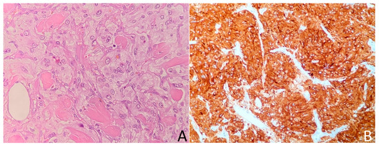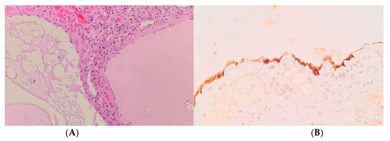 Adrenal lymphangioma—the tumor adjoins the adrenal cortex and consists of numerous cysts filled with proteinaceous content ((A), hematoxylin and eosin, 100× magnification), and lined with podoplanin-expressing lymphatic endothelium. Immunohistochemistry for podoplanin, 400× magnification (B).
