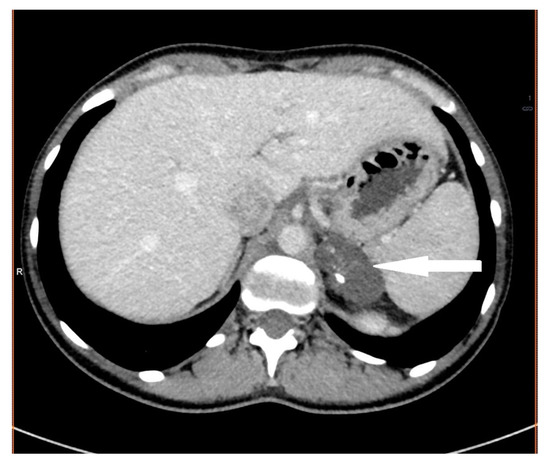 A 19-year-old female patient was admitted to the department of endocrinology for hormonal evaluation, in the course of which a left adrenal gland mass was detected during the diagnostics of hyperandrogenism. The patient had a medical history of oligomenorrhea since puberty, as well as elevated serum testosterone and androstenedione concentration. The abdominal CT scan demonstrated a hypodense cystic lesion in the left adrenal gland, measuring 12 × 9 mm (Figure 7). The patient had mild hirsutism (assessed at three points on the Ferriman–Gallwey scale), but no other signs of endocrinopathy were noted. Biochemical tests revealed a slightly elevated concentration of androstenedione (3.8 ng/mL) and testosterone (4.91 nmol/L) (Table 1. P5 F/19). Due to clinical and laboratory features of hyperandrogenemia, a dexamethasone androgen-suppression test (5 days, 4 × 0.5 mg/d) was performed, resulting in the suppression of androgens concentrations. Based on these findings, a hormonally inactive adrenal tumor and functional hyperandrogenism were diagnosed. A CT scan performed eight years later revealed progression in size of the adrenal mass to 29 × 23 × 22 mm, with a solid part within it (Figure 8). Hormonal reassessment showed androstenedione and DHEA-S within the normal range of concentration (Table 1. P5 F/27). Due to the young age of the patient, the declared carcinophobia, and the progression in tumor size, a left-sided adrenalectomy was scheduled. Based on the histopathological examination of the adrenal gland, a diagnosis of lymphangioma was established (AGL) (Figure 9).