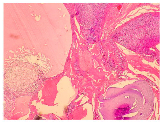 A 27-year-old woman was admitted to the department of endocrinology clinic due to a left adrenal gland tumor detected in an abdominal ultrasound. The examination was performed as a part of diagnostics process of abdominal pain and unintentional weight loss (approx. 10 kg) over the past year. A physical examination revealed the patient to be underweight (BMI—17 kg/m2), with hemiparesis resulting from cerebral palsy, and tenderness on palpation of the umbilical and left hypochondriac region. Biochemical tests showed no significant abnormalities in hormonal work-up (Table 1). The CT scans demonstrated the presence of a polycyclic thin-walled cystic tumor in the left adrenal gland measuring 45 × 28 × 29 mm (Figure 5). The patient was referred for laparoscopic adrenalectomy. Histopathological examination revealed a multilocular cyst lined with attenuated endothelial cells with septal calcifications. The histological appearance corresponded to the diagnosis of endothelial cysts (EC) (Figure 6).