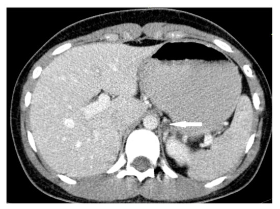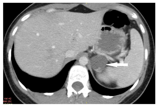 - Bibi, M.; Sellami, A.; Taktak, T.; Chelly, B.; Ghorbel, Z.; Zouari, H.; Boukriba, S.; Boussafa, H.; Chehida, M.a.B.; Rhouma, S.B.; et al. Giant cystic lymphangioma of adrenal gland: A case report and review of the literature. Urol. Case Rep. 2018, 22, 6–7. [Google Scholar] [CrossRef]