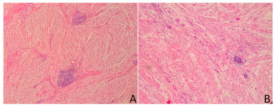 Ganglioneuroma—the tumor is mainly composed of Schwann cells forming fascicles in the myxoid stroma ((A), hematoxylin and eosin, 400× magnification). The mature ganglion cells are scattered throughout the tumor in small groups; they are characterized by abundant, eosinophilic cytoplasm and a round, eccentrically located nuclei ((B), hematoxylin and eosin, 400× magnification). Furthermore, focal lymphocytic infiltrates are visible (well visible in photo (A)).