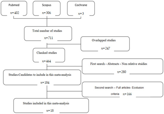 The search engines used for this study were PubMed, Scopus, and Cochrane. We will also check the reference list of the articles for references that may have been missed by electronic search. An effort was made to correct the overlap between the three search engines. Among 711 detected studies, 402 derived from PubMed, 306 from Scopus, and 3 from Cochrane. By removing the overlapped/double studies that were 247, a total 464 studies were used for the purpose of this study (Figure 1).