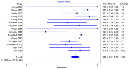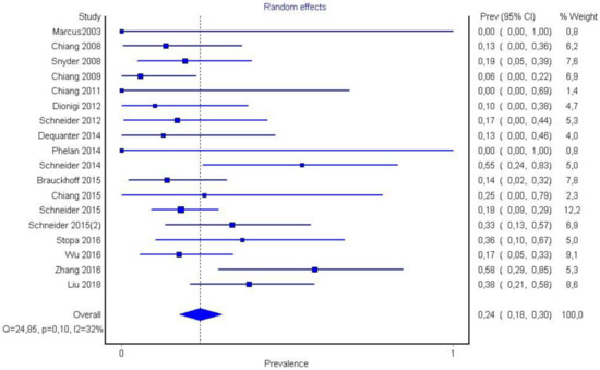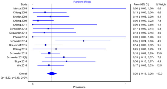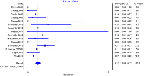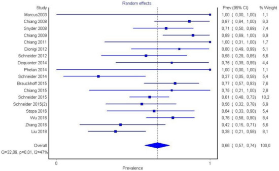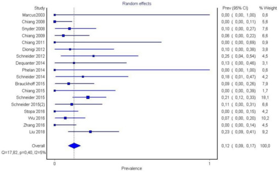 It is also important to notice that the results of studies for region P1 have moderate heterogeneity (I2 = 47%, p = 0.01) (Figure 2, Figure 3 and Figure 4) while in regions P2 (Figure 4 and Figure 5) and P3 (Figure 6 and Figure 7) there is no heterogeneity (I2 = 32%, p = 0.10 and I2 = 5%, p = 0.40 respectively). In each case all the results are considered to be normally distributed.