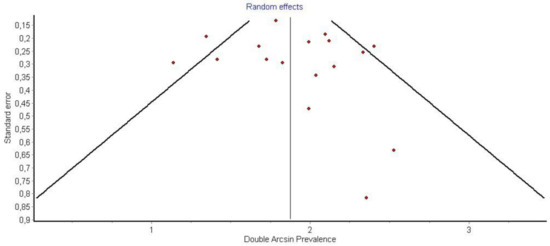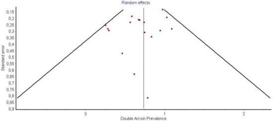 In region P1, loss of signal was observed in 180 nerves. Region P1 was also observed in 66% (CI 95%: 57–74%) of cases. Ιn region P2 of the nerve, a loss of signal was observed in n = 63 nerves corresponding to a 24% (CI 95%: 18–30%) ratio, while in region P3, it was observed in n = 34 corresponding o 12% (CI 95%: 57–74%). Publication bias and heterogeneity concerning P1, P2, and P3 value was also assessed via funnel plots.