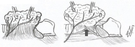 Thyroid, Berry’s ligament and the recurrent laryngeal nerve (drawing of the authors). The arrows show the nerve.