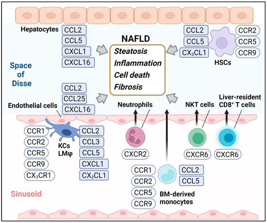 In this review, we will highlight recent updates on the roles of chemokines, including CCL3, CCL25, CXCL1, CXCL16, and CX3CL1 (Figure 1), in the development of NAFLD and their blockade as a potential therapeutic approach.