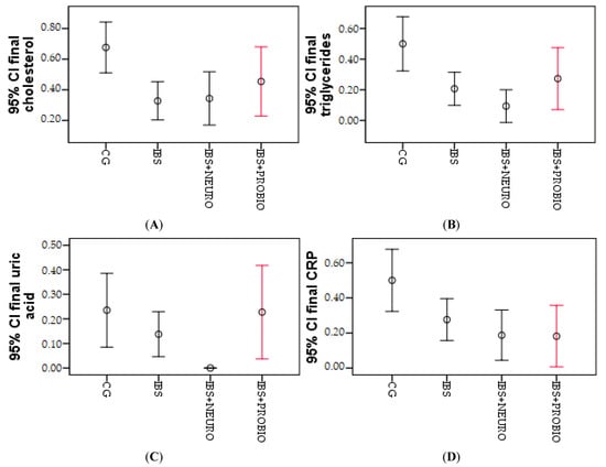 Graphical representation of the mean cholesterol (A), triglycerides (B), uric acid (C), and CRP (D) at the end of the research period in the 3 groups.