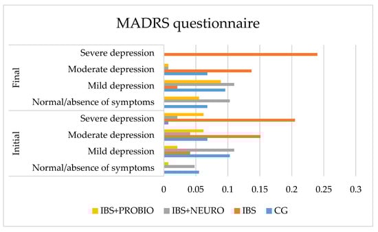 The graphical presentation of MADRS in each group at the beginning of the study can be seen in Figure 2. It depicts the lowest values in the CG, meaning that the symptomatology period greatly influenced the quality of life, which was measured using MADRS. In the IBS + NEURO group, following the neuropsychiatric treatment, more than 5% of the patients did not present any symptoms of depression on this scale. The best results were observed in the IBS + PROBIO group.