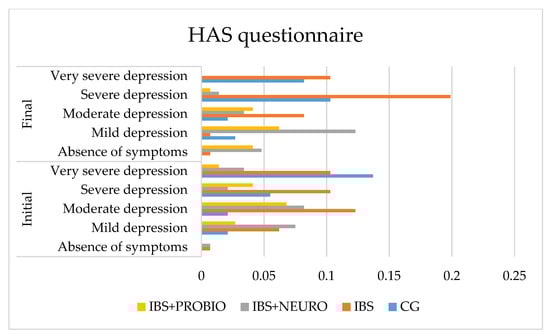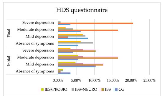 - In the IBS + PROBIO group, the number of asymptomatic patients decreased by 2.9%, mild depression increased by 11.1%, moderate depression decreased by 5.2%, and severe depression decreased by 3.2% of cases, measured with the HDS scale, compared with IBS + NEURO.