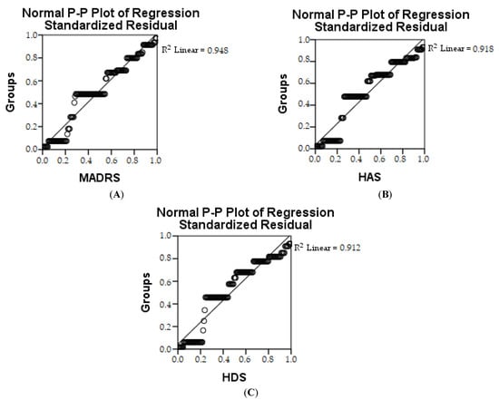 Linear regression of MADRS (A), HAS (B), and HDS (C) depending on groups.