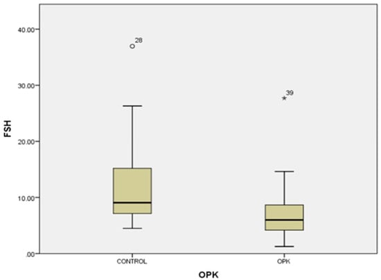 Univariate analysis of the relationship between FSH serum levels and PCOS (p < 0.005). Circles represent high potential outliers and the stars represent high extreme values.