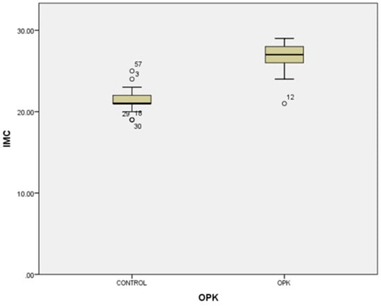 Univariate analysis between body mass index and PCOS (p < 0.01). Circles represent high potential outliers and the stars represent high extreme values.