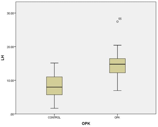Univariate analysis between LH serum levels and PCOS (p < 0.001). Circles represent high potential outliers and the stars represent high extreme values.