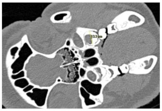The aim of this preliminary investigation was to assess the impact of ZOL administration on tooth growth, based on CT-data of the BRONJ animal model investigation and due to this study design, no formal sample size calculation was performed. In the context of this investigation, the animals were divided into two groups. Group 1 (n = 3) comprises the animals that did not receive ZOL and thus serves as a control group. Group 2 (n = 8) includes all animals that were administered ZOL as part of the BRONJ animal investigation. Tooth growth of the 2nd molar (M2) was evaluated using computed tomography (CT) scans performed at two different times during the BP administration period (CT1 and CT2). CT-data were acquired using a Siemens SOMATOM Emotion 6 (Siemens, Erlangen, Germany) with a tube voltage of 130 kVp and tube current of 125 mA. The acquired images had a slice thickness of 0.63 mm and a resolution of 0.5 mm. CT1 was performed at the time of initiating weekly BP administration in all animals. CT2 was performed after a mean duration of a further 17 weeks of ZOL administration (range 12–19 weeks). The size of the second maxillary molar at the time of CT1 and CT2 was evaluated using VoXim Osteo 6.0 (IVS Solutions AG, Germany) by determining the outer contour of the tooth as the interface between the hyperdense structure of the tooth and the hypodense structure of the desmodontal gap (Figure 1). Each tooth was measured in three sectional planes, with measurements performed in two axes per plane (Tabel 1); for better comparability, we delimited the measuring ranges using a graphic plateau selection.